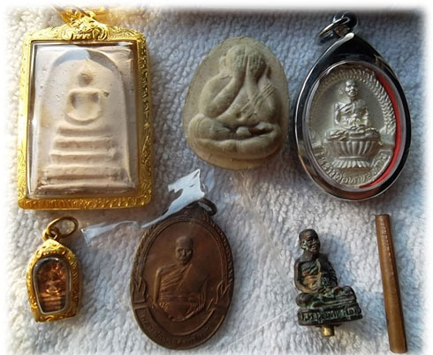 แถวหน้า 1.นาคปรก พศ.2538(มีรุ่นเดียว) 2.เหรียญรุ่นแรก พศ.2519 3.รูปหล่อรุ่น2 ฝังตระกรุดออกที่วัดห้วยมงคล 2538 4.ตระกรุดดอกเล็ก