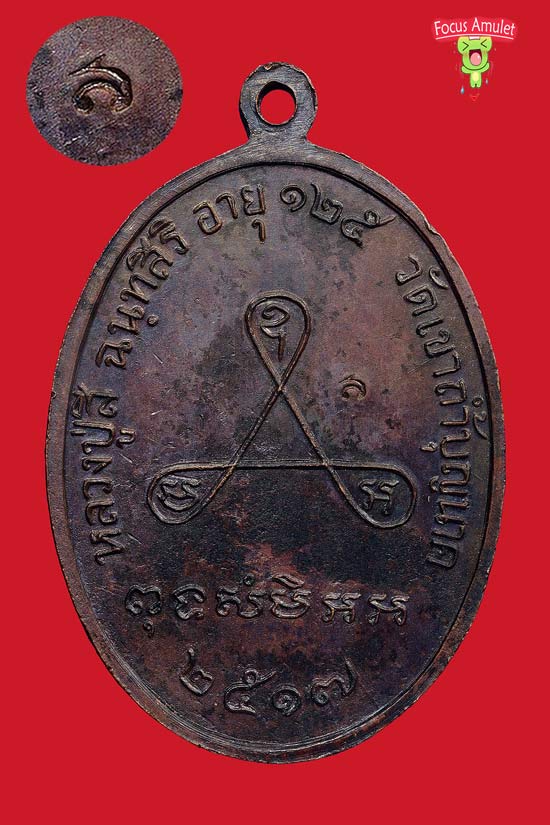 เหรียญรุ่นนี้สร้างเมื่อ พ.ศ.๒๕๑๗ โดยนายแพทย์วิเชียร ตระกูลสิน และจ.อ.นริศ ไชยมงคล เป็นผู้ดำเนินการสร้าง มีทั้งสิ้น ๔ เนื้อด้วยกัน คือ เนื้อทองคำ ๑๖ เหรียญ, เนื้อเงิน ๑๒๕ เหรียญ, เนื้อนวะ ๑,๑๒๕ เหรียญ และเนื้อทองแดง ๘,๘๖๐ เหรียญ ด้านหน้าเหรียญเป็นรูปหลวงปู่สีนั่งสมาธิเต็มองค์ มียันต์ที่สังฆาฏิ ด้านล่างมีตัวหนังสือเขียนว่า "อายุยืน" ส่วนด้านหลังเหรียญ ตรงกลางเป็นยันต์ใบพัด กำกับด้วยอักขระขอม "มะ อะ อุ" ใต้ยันต์มีอักขระขอมกำกับ ๑ แถว ด้านล่างมีตัวเลขไทย "๒๕๑๗" ใต้ขอบเหรียญด้านซ้าย-ขวา และด้านบน มีตัวหนังสือเขียนว่า "หลวงปู่สี ฉนฺทสิริ อายุ ๑๒๕ วัดเขาถ้ำบุญนาค"......................>>>>>>>>>>>>>>>>>>>>>>>>>>> ( สำหรับเหรียญนี้สภาพสวยคมครับ ผิวสวยมากครับ รมดำเดิมๆ )  |