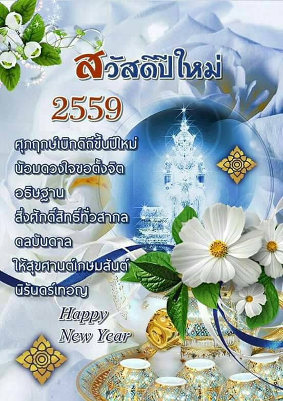 ***...ในศุภวาระดิถีขึ้นปีใหม่ 2559 ขอให้บุญรักษา เทวดาคุ้มครองท่านและครอบครัว ขออาราธนาคุณพระรัตนตรัย และสิ่งศักดิ์สิทธิ์ทั้งหลายที่ท่านเคารพนับถือได้โปรดดลบันดาลประทานพรให้ท่านและครอบครัวประสพแต่ความสุข ความเจริญ สมหวังในสิ่งอันพึงปรารถนาทุกประการ มีสุขภาพพลานามัยแข็งแรงประสบความสำเร็จ ในหน้าที่การงาน มีแต่ความสุข ความเจริญ มีความร่มเย็น และมีความสุข ร่ำรวยเงินทองและทรัพย์สินตั้งแต่วันนี้และตลอดไป...สวัสดีปีใหม่ ครับ