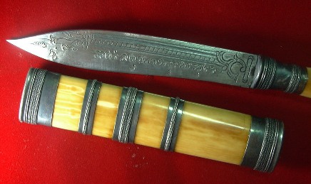 หาหลวงพ่อเดิมไม่ได้ก็ใช้ของท่านแหละครับ ดีไม่แพ้กัน เล่มนี้ของหลวงพ่อบุญมี วัดเขาสมอคอน ท่านเป็นเกจิที่คนลพบุรีนับถือมากครับ ผมคนหนึ่งแหละครับ ด้ามงา ฝักงาแบบนี้หายากครับ ใบยาว4-5 นิ้ว เดี่ยวนี้ยัดเยียดกันเยอะครับ ของปลอมก็ยัดว่าเป็นมีดท่าน ที่เห็นปลอมมากก็มีหลวงพ่อกวย หลวงพ่อเดิม และหลวงพ่อมีนี้แหละครับ |