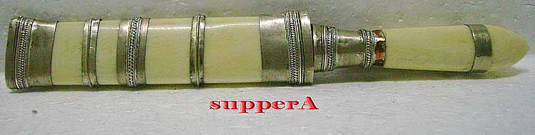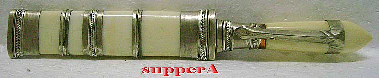 มีดหมอปากกา ด้ามงา ฝักงา หลวงปู่จ้อย วัดศรีอุทุมพร ใบมีดสตางค์ ปี ๒๕๔๘ สร้างจำนวนน้อยโดยเพาะใบมีดสตางค์จะมีจำนวนน้อยกว่าใบมีด ที่เป็นใบมีดเหล็กสังขวานร ตอกโค๊ต นะ ที่ใบมีด ทั้ง ๒ ข้าง มีรอยจารอักขรยันต์ที่ฝักทั้ง ๒ ด้าน ขนาดความยาวทั้งเล่ม ๔.๕ นิ้ว ใบมีดยาว ๒.๕ นิ้วครับ..  |
