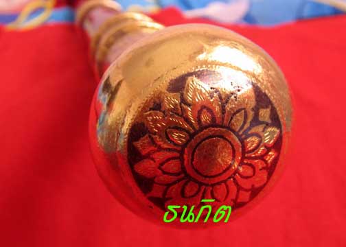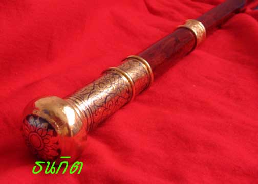 ส่วนหัวและปลายไม้เท้าเป็นโลหะลงถมทองสวยงามวิจิตรตระการตาด้วยฝีมือช่างเมืองนครฝีมือชั้นครู ภายในบรรจุลูกอมรุ่นมงคลจักรวาลพุทธราคมเขาอ้อซึ่ง พล.ต.ต. ขุนพันธรักษ์ราชเดช เป็นประธานจัดสร้างเมื่อปี 2545